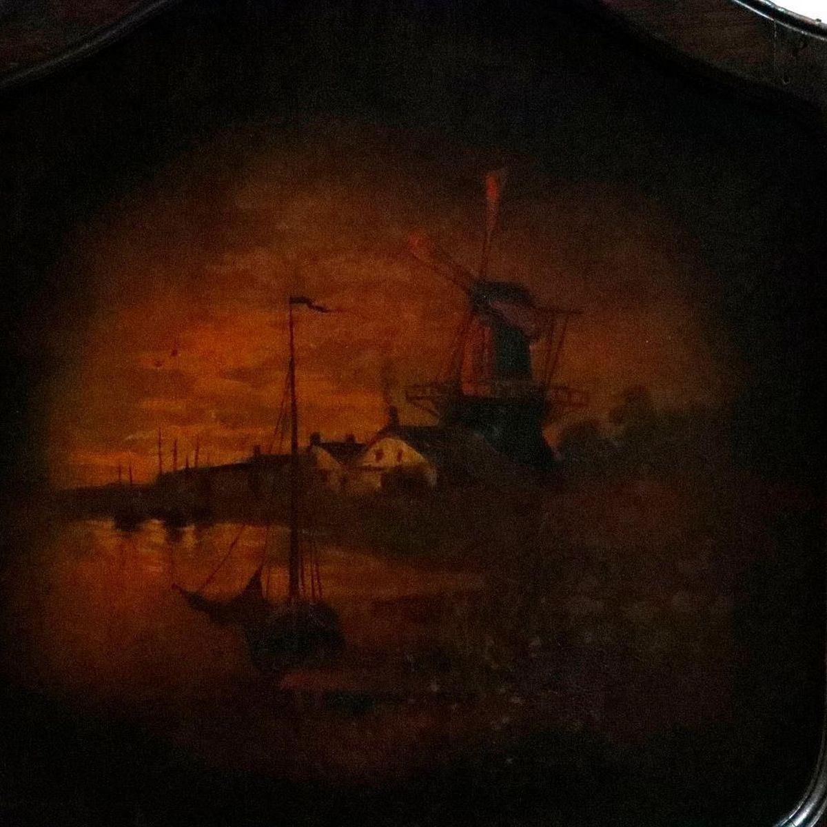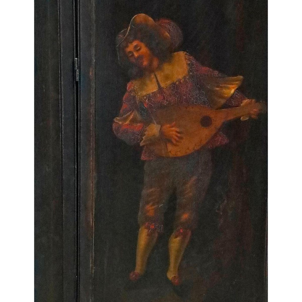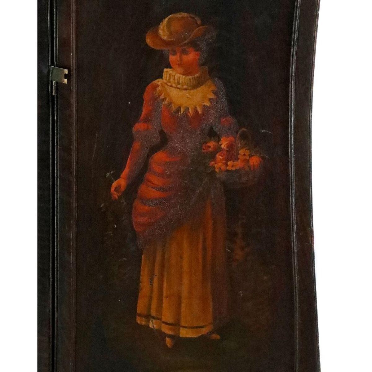 Painted with Dutch harbor scenes and figures in 18th century dress, and floral garlands on the reverse. 66in. (170cm) h. width of each panel 16 1/2in. (41cm) Condition: Very good. Floral panels later applied with rope twist ribbon banding.