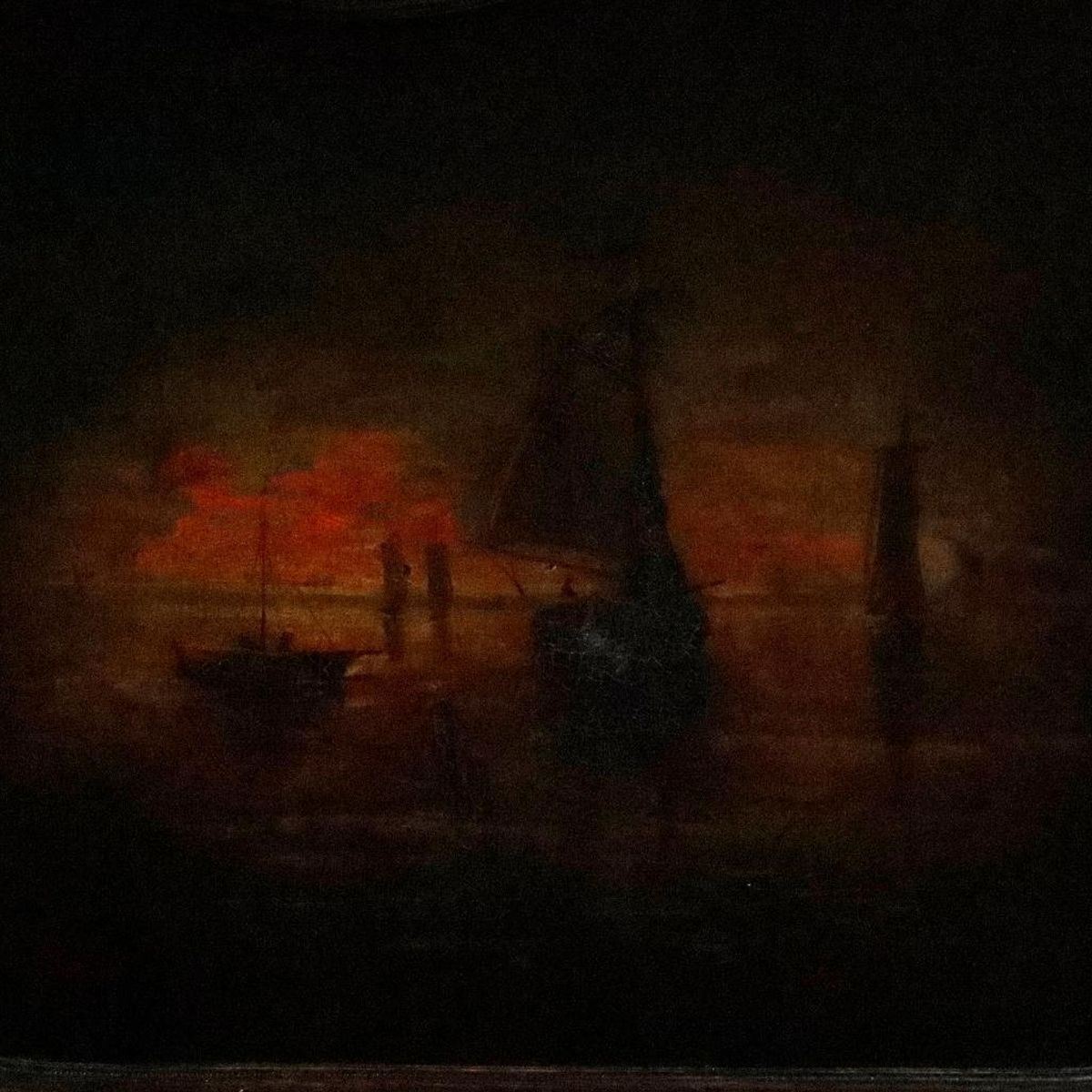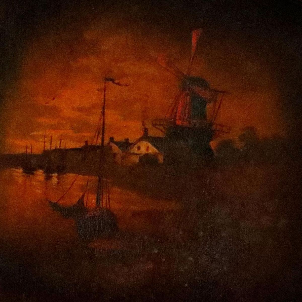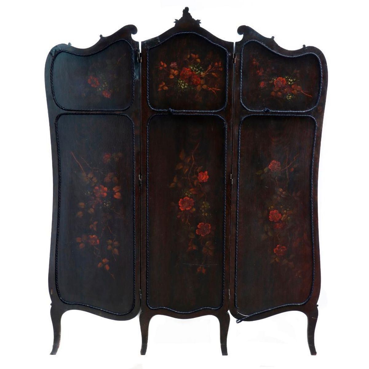 Painted with Dutch harbor scenes and figures in 18th century dress, and floral garlands on the reverse. 66in. (170cm) h. width of each panel 16 1/2in. (41cm) Condition: Very good. Floral panels later applied with rope twist ribbon banding.