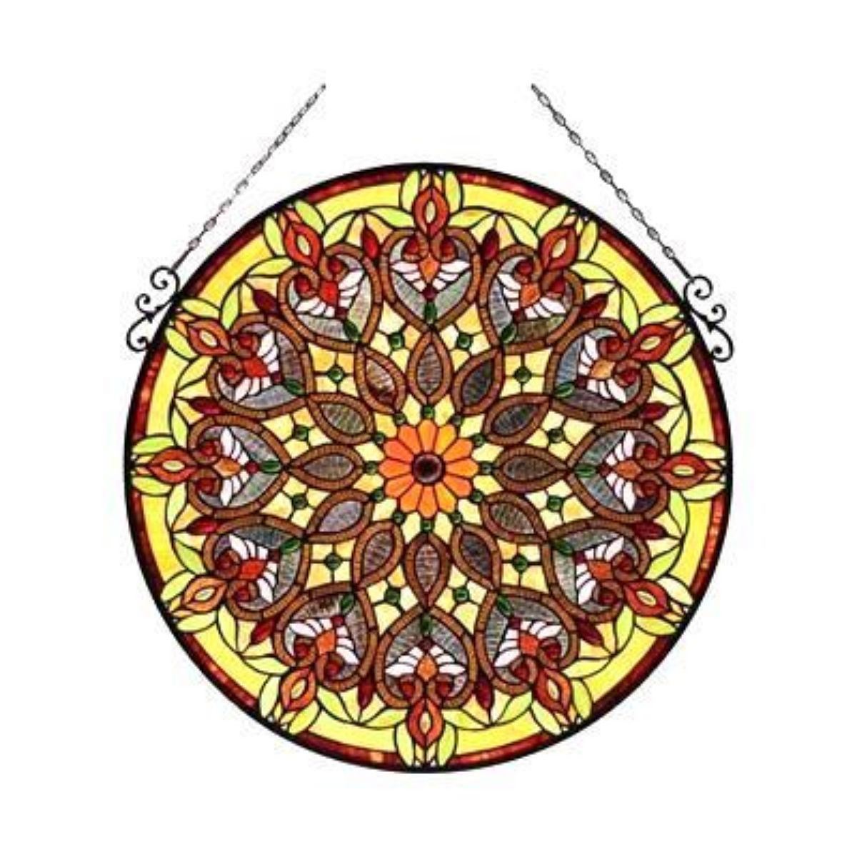 Victorian Tiffany-style stained art glass, 525 pieces & 97 glass beads, wrapped in copper foil, set into a round, hanging window panel. 27" H X 25 1/2" W.Â
