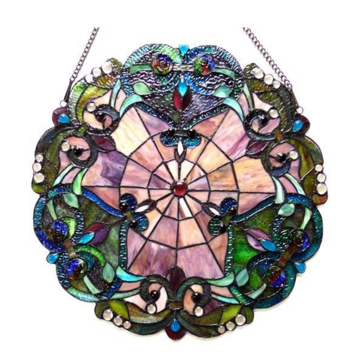 Tiffany-style, newly created Victorian blossom window panel, hand-rafted with 323 colorful stained glass cuts & 52 beads. Round shape, 20"D. 8 pound weight. Â