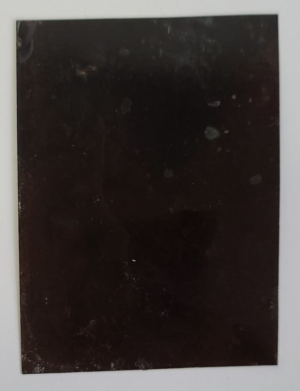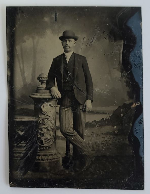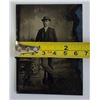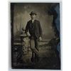 Victorian era tintype photograph of a man leaning on an ornamental column. Tintype has significant damage to the front. There is heat/chemical damage to the right side as well as scratches on front. Minor damageonthe back. Measurements (3 1/2'H*2 3/4'W)3 1/2'H*2 3/4'W