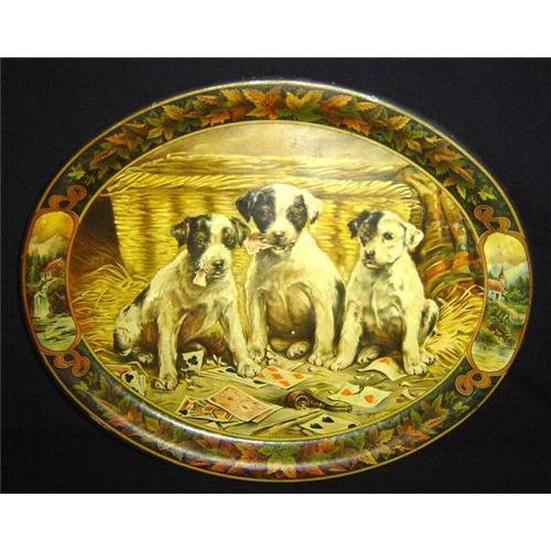 This wonderful transferware Tole Tray depicts three dogs playing cards on a barn floor, with large wicker basket. Wonderful for dog lovers! Would make great tray table.