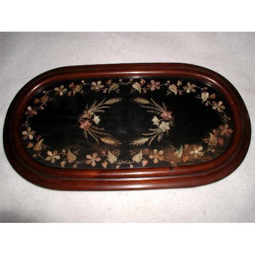 Beautiful delicate finely stitched needlework of floral and leaf in silk on silk fabric under glass. Rich gold,copper and silver grey tones on black background. The oval Victorian walnut framed tray stands on lare bun feet. The back attached with several screws. Made as the center decoration on the dining table in Victorian 19th century times for taxidery-to hold a large glass dome over small stuffed birds,pheasants or quail arrangement with branches and floral. The tray is in wonderful condition,one slightly darker spot on the edge appears as a burn. The needlework is totally intact and gorgeous workmanship with small area of black background silk on right bottom edge reverting to a dark gold. However,matches the shading of the needlework. Measures 23.5L X 12.5W X 1.75H.