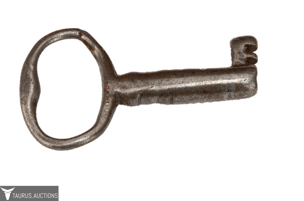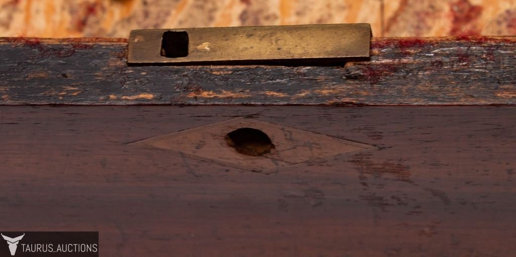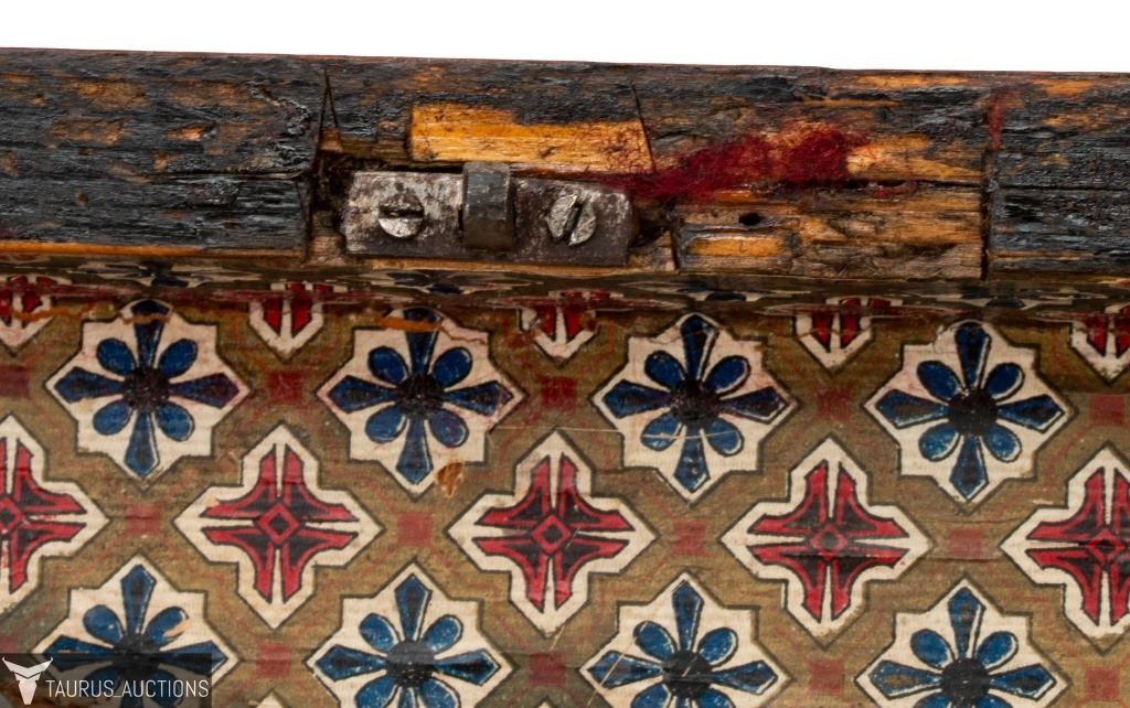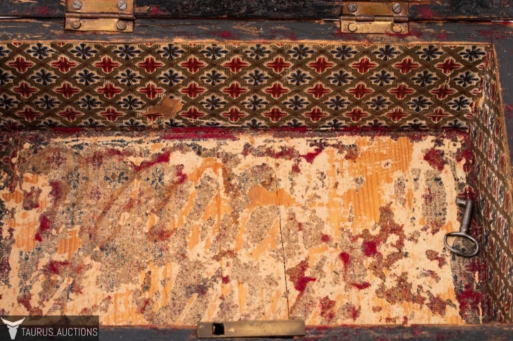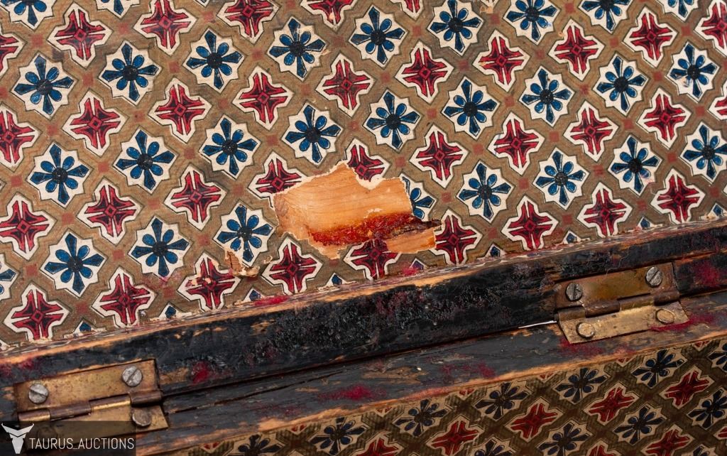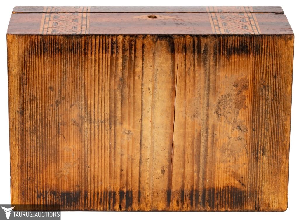 Condition: Surface scratches and wear. Chipping. Some loss to paper lining. Exterior key plate missing as is internal cylinder tumbler. Key can be inserted and turned, but box currently does not lock. Bend to key.