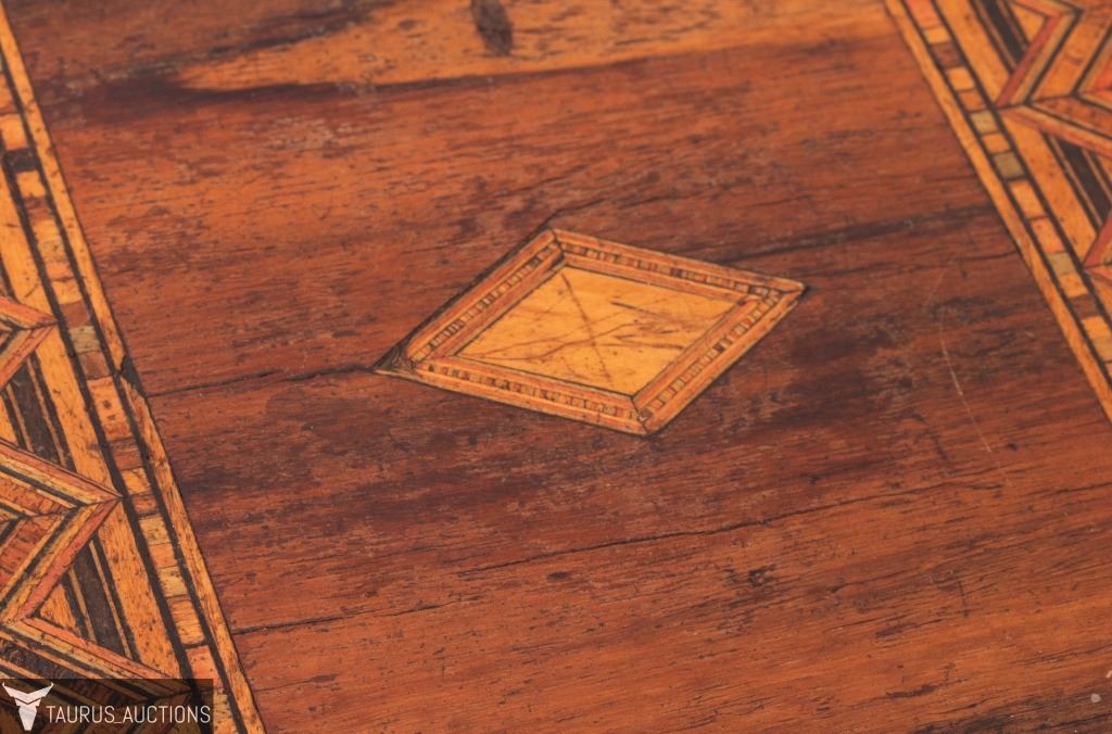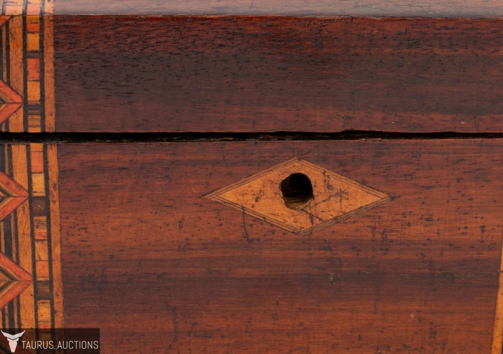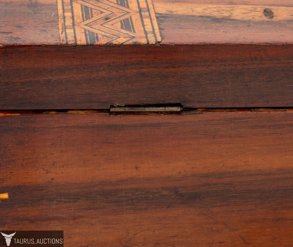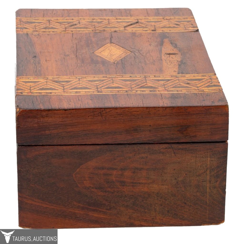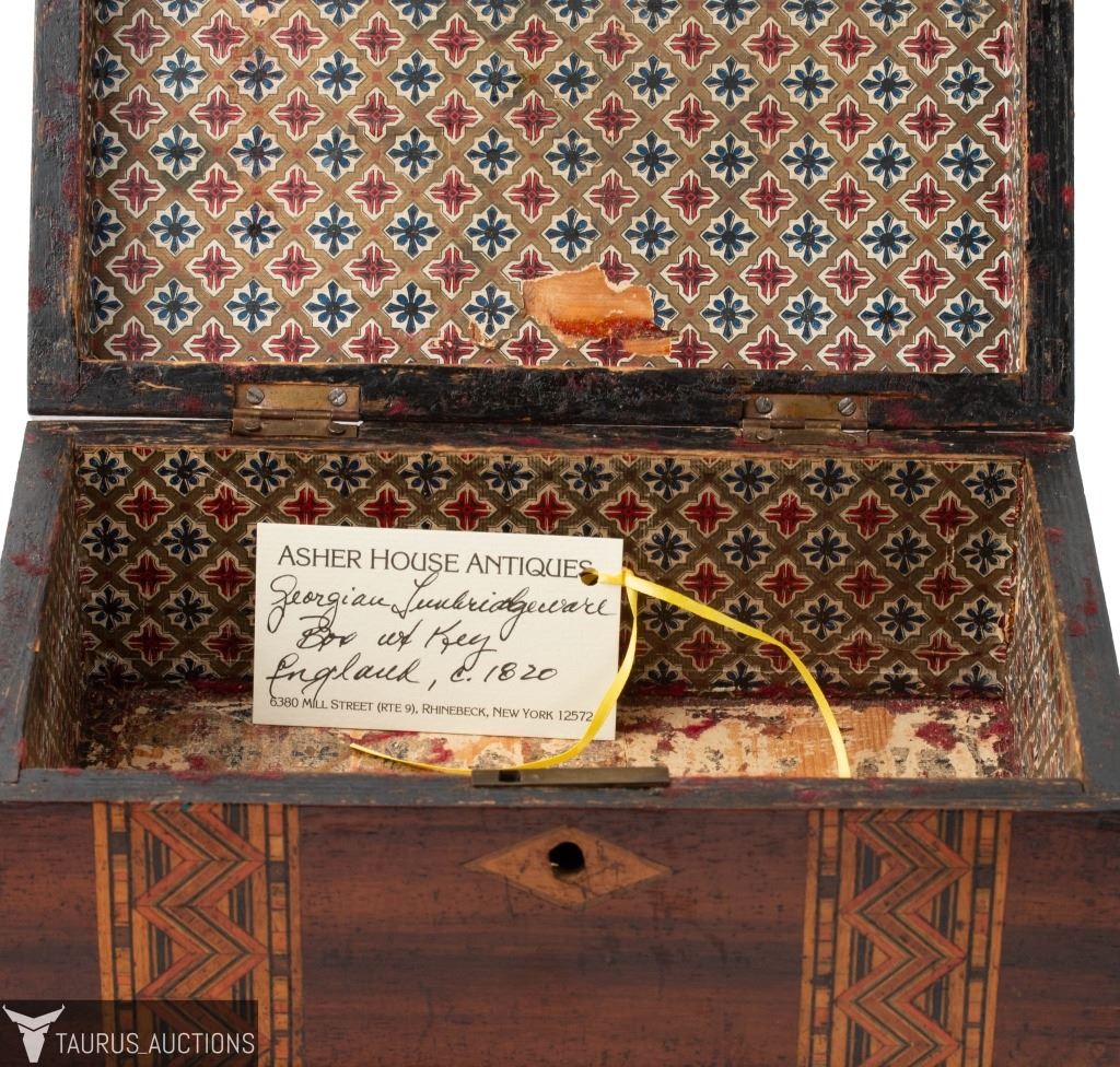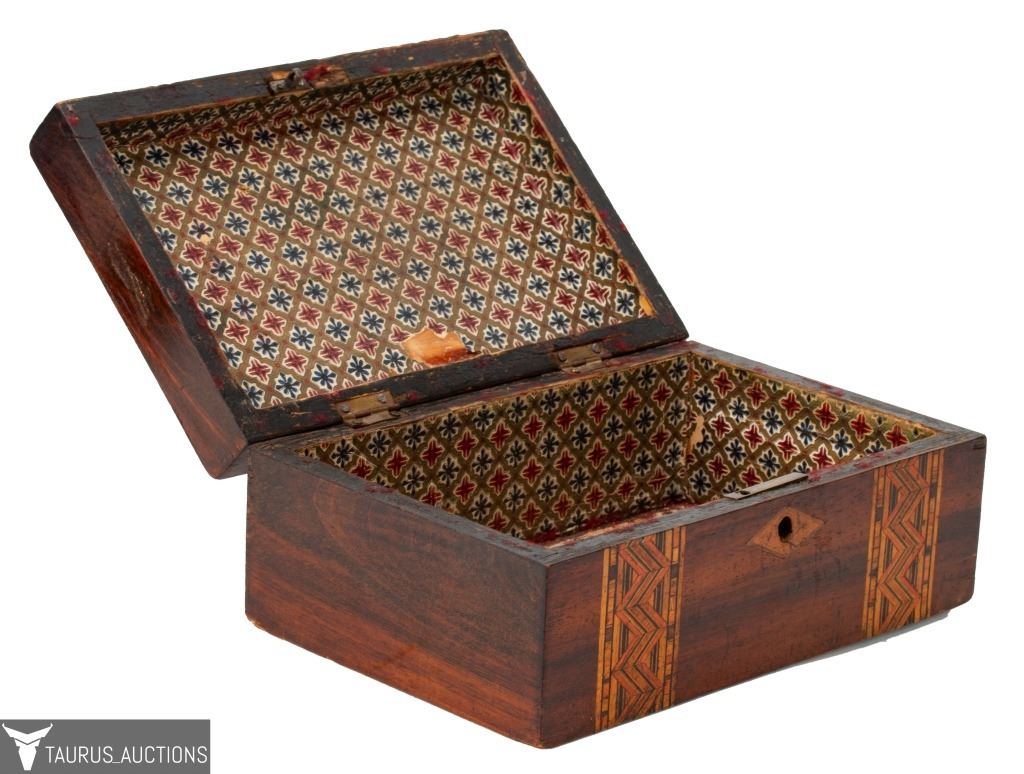 Item/Description: Document box lined with decorative paper. Fashioned from mixed woods including rosewood, walnut. Exterior decorated with beautifully inlaid geometric parquetry in colorful hues. Masterful craftsmanship. Hinged lid, Key hole with key included as shown. Interior covered with colorful antique paper liner.