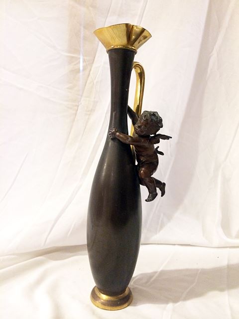 Victorian Vase with Cherub figurine. Full, 3-dimensional cherub adorns vase with gold handle, base, and fluted top.
