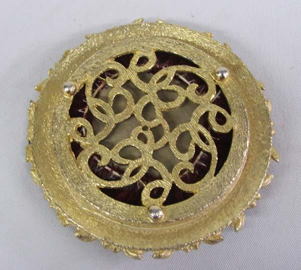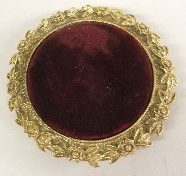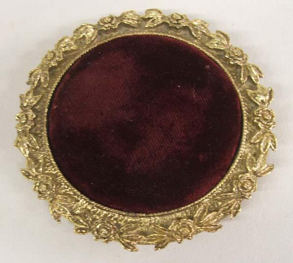 Victorian Velvet Pin Cushion. Polished Bronze stand and holder. Measures 3.6'' diameter x 0.5'' high. Buyers Pay Actual Shipping and Handling Charges(see terms and conditions for more information).
