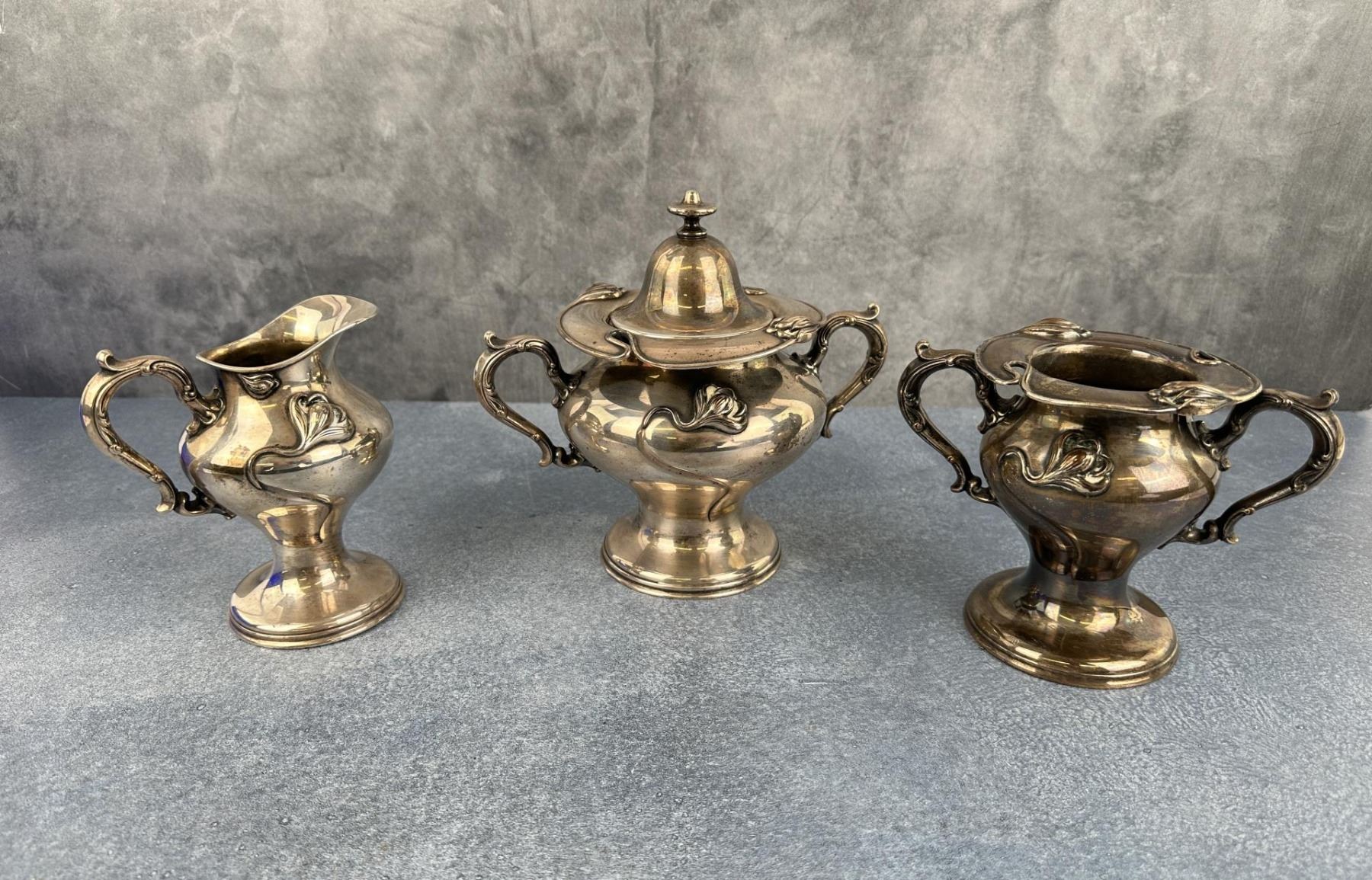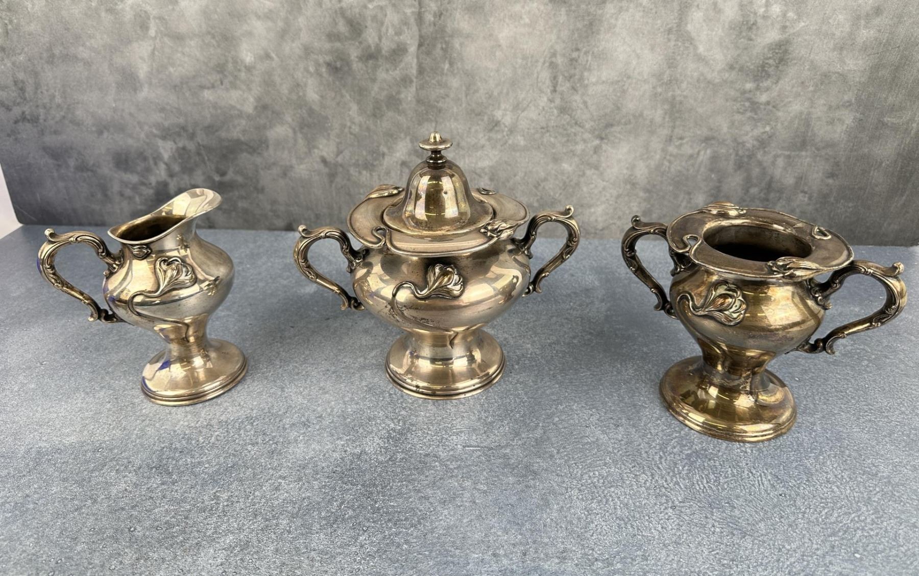 Creamer, Sugar and Mustard Pot. Largest piece is 7 1/4" tall.