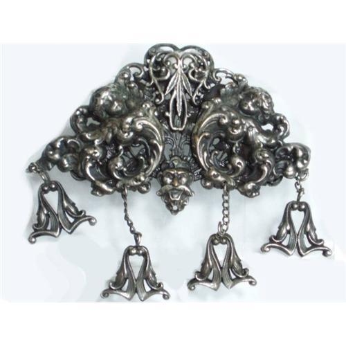 What an EXTRAORDINARY Victorian Vinaigrette or pomander this is! Hidden in the depths of cherubs and Bacchus there is a vase shaped compartment with a tiny piece of cotton which would have been used to hold a young woman's favorite scent or oil ( or even smelling salts). The brooch is HUGE ( 3 1/2" wide x 3 1/4" long) and heavy and really well made. IT has layers of metal work with the cherubs on each side as well as Bacchus the God of Wine who is guarding this fabulous aesthetic piece! The drops are nouveau like flowers that hang from chains and they really add to the charm of this magnificent old brooch. Signed on the back Style metal Spec NY.