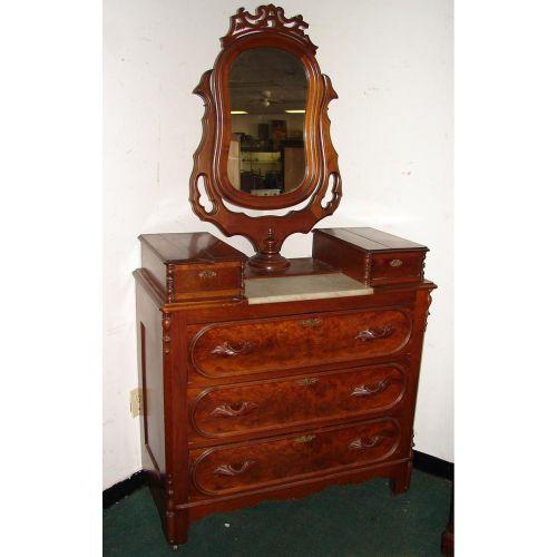 Dresser has Glove Box top and pedestal shape mirror. Carved Pulls. Excellent condition. 42" x 40" x 71" tall