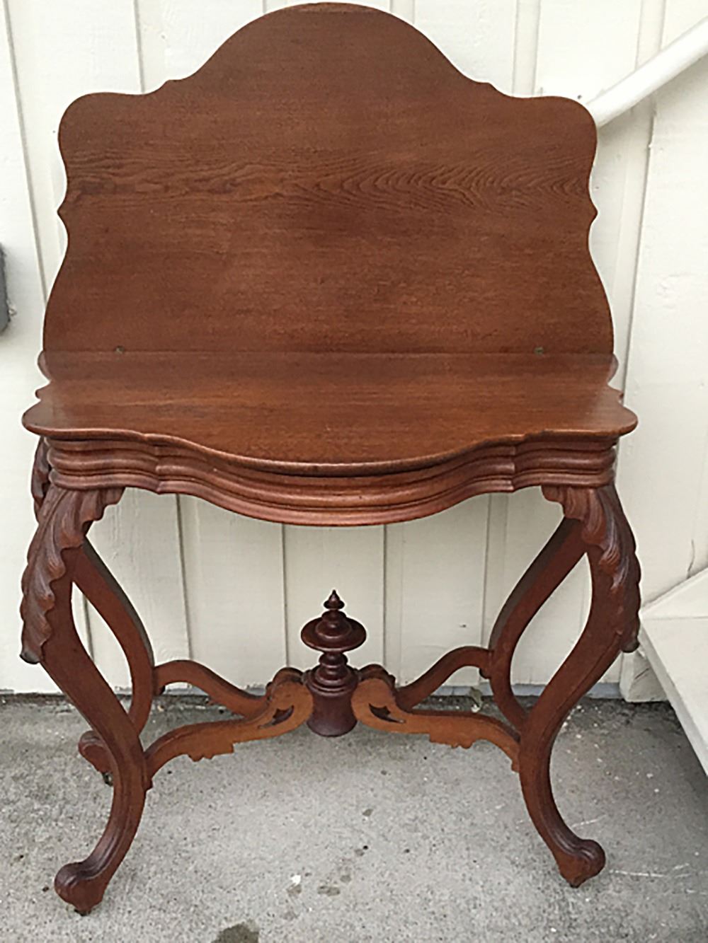 Victorian Walnut game table, c. 1860s. Beautiful turtle shaped lift top game table, has original carved walnut finial at base, all original finish with brass castors. Nice, clean, original example of Victorian game table. Measures approx. 18" deep x 31" long x 27 1/2" high