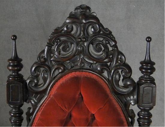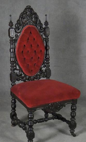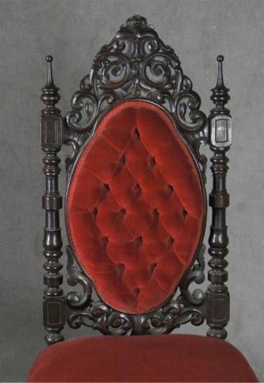 Victorian Walnut Side Chair_Circa 1880. Carved and turned oval back with button tuffed panel. Upholstered in red velvet.
