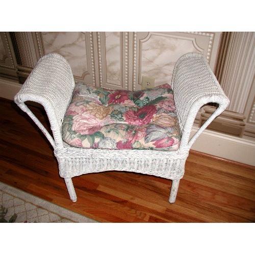 </font></strong>Victorian wicker chair or bench C.1890-1900 has indented areas for the forearm in the wide 8" arms. Floral,tufted and reversible cushion sits above 6 tightly tied springs supported with 4 cross supports beneath as well as two on each arm attesting to the quality and sturdiness of the piece. Braided trim surrounds the high arhced apron on all sides. Tiny bits of missing paint in the tightly woven wicker with aged paint in wonderful condition. Bench in excellent condition overall. Measures 35L X 25H X 19.5D.</font>