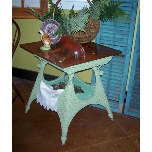Here we have a fine old table in wicker with an unusual form. The legs are splayed, which gives room for an ample lower shelf. The table has old, but not original, green paint, chippy in some places, and the top is a replacement (looks like cherry). The table has a wonderful look for a porch, bedroom, or wherever you may want the warmth and charm of old wicker. The table measures 25" by 26" by 28" high.