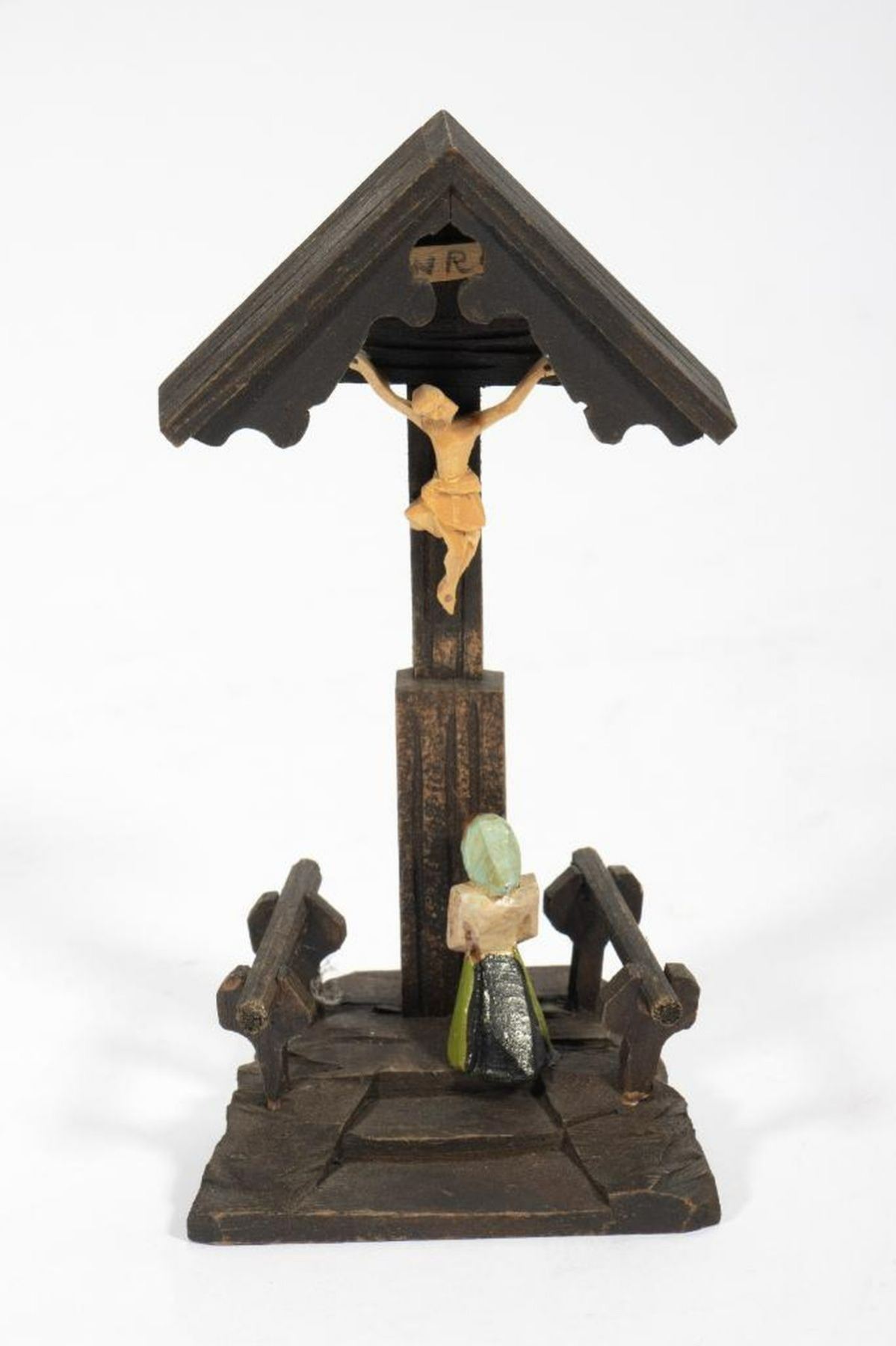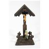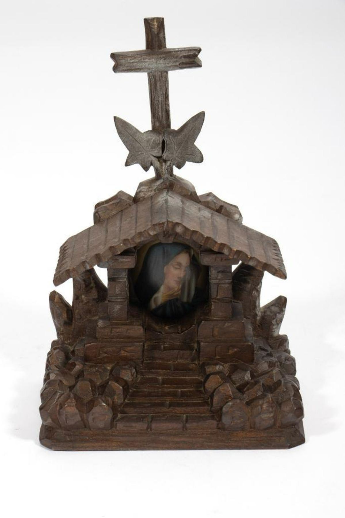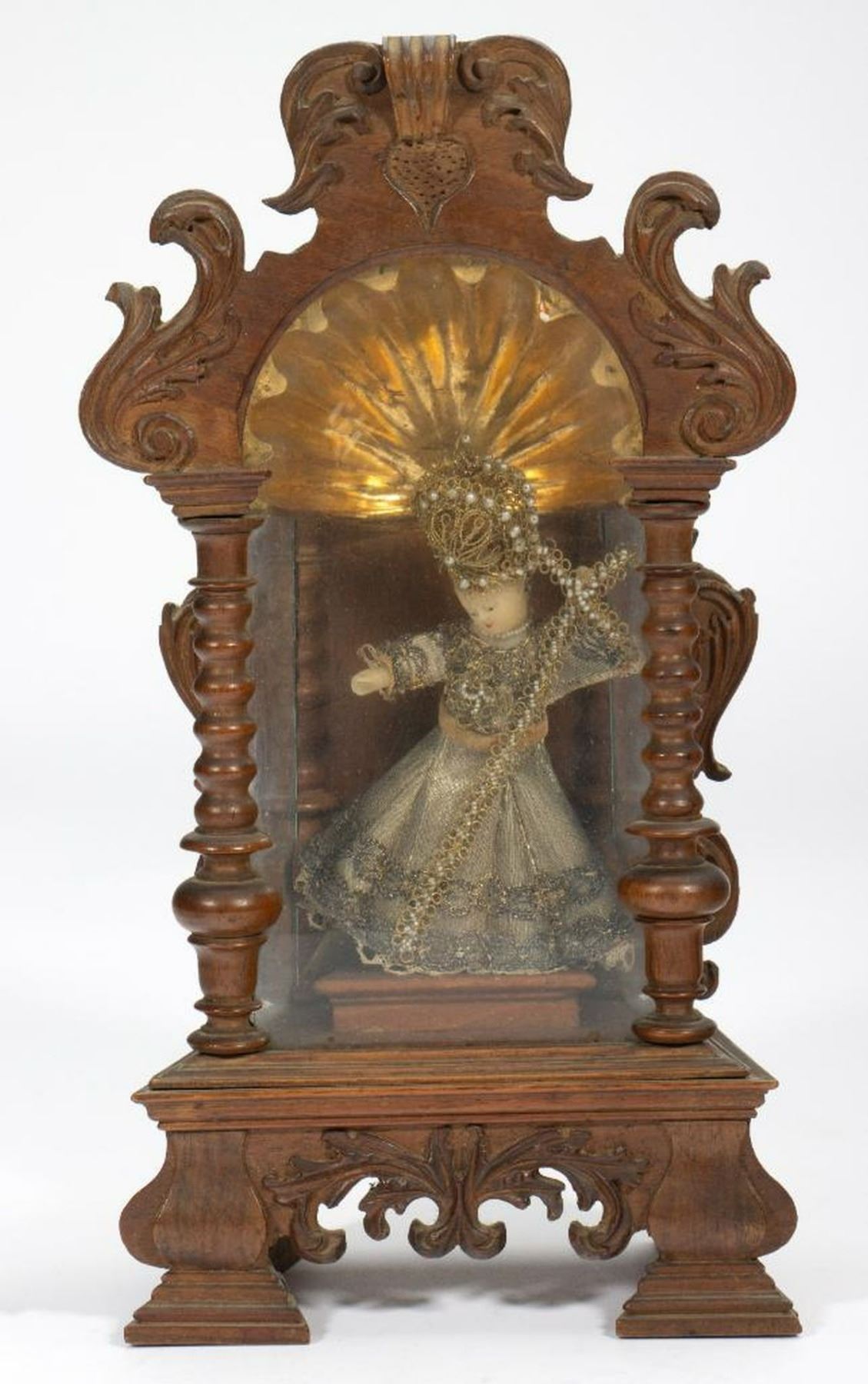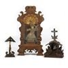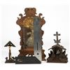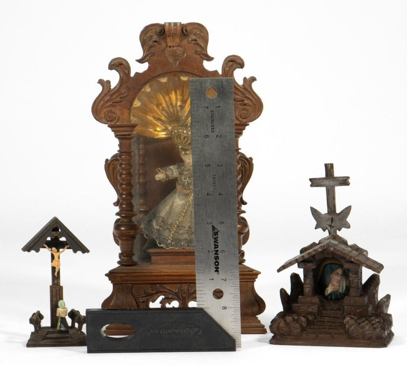 The small standing altar with a glassed-in niche holding a wax figure of the Infant beneath a giltwood dome; 11 3/8in. x 6in. x 3 1/2 in. Together with two more contemporary Black Forest style carved wood devotional objects, 4 1/2in. and 6 1/2in. tall. Condition: The case/figure are in overall good condition, though the figure's feet have broken off and are loose.