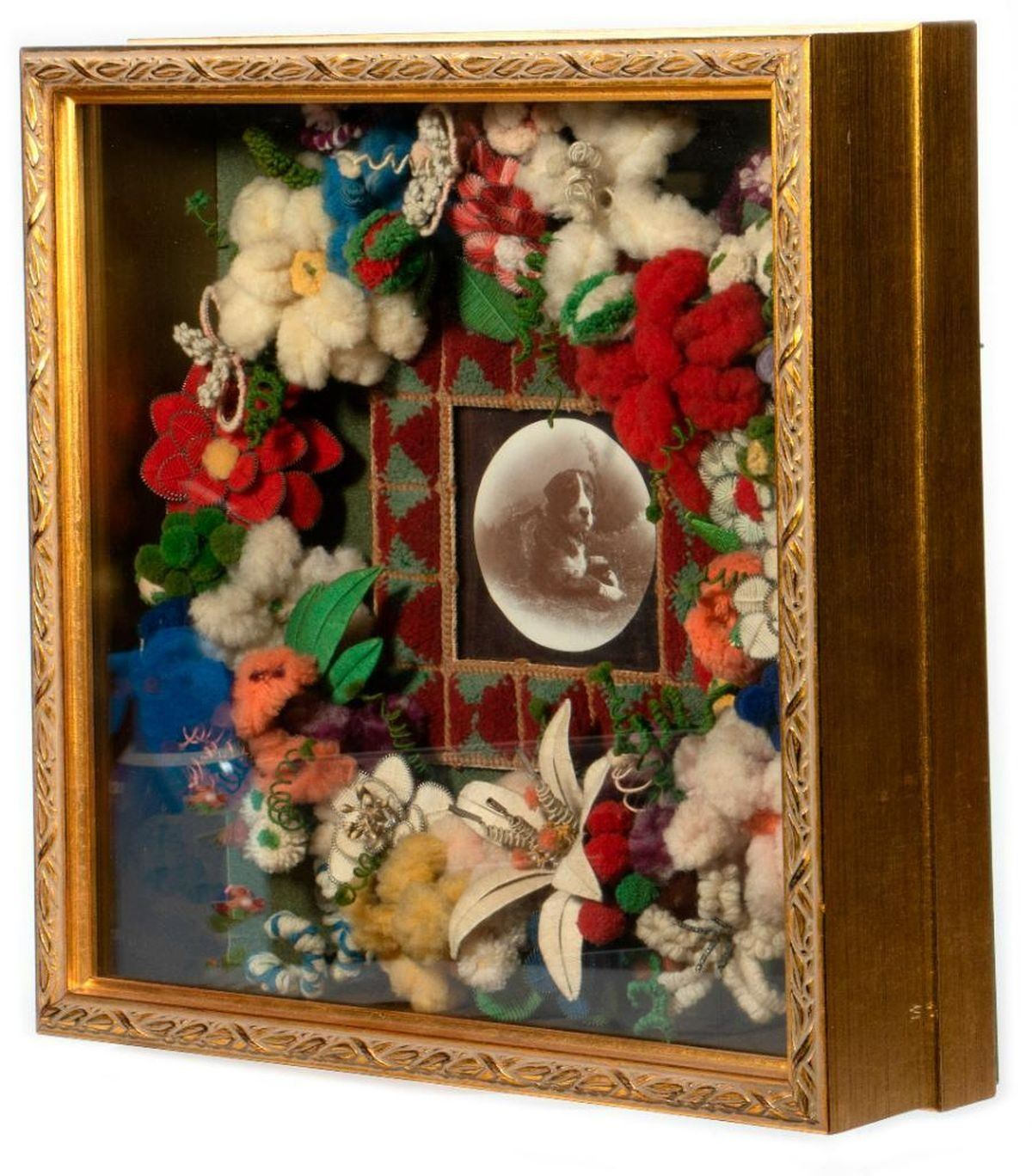 The shadow box enclosing a wool work wreath centering a photo of a beloved dog. 13 1/2in. w. 13 1/2in. l. 4in. d. Condition: Very good.