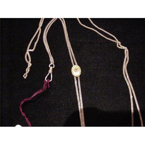Outstanding Victorian Circa 1880 10kt yellow gold fancy link 50" long chain with yellow gold Etrusccan style ruby slide and watch hook in wonderful condition. Fabulous piece. Pretty Slide. Wonderful wonderful chain.