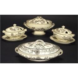 Victorian aesthetic pottery tureen and two matching smaller tureens on stands and also Richmond aesthetic pottery tureen transfer printed with a bird and flowers, largest 37cm long