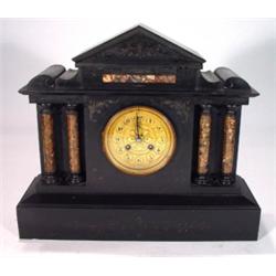 Victorian black slate and marble inlaid chiming mantel clock with brass dial, 34cm high