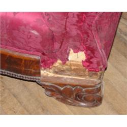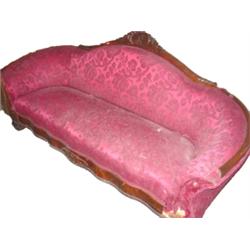 Victorian burl walnut decorative sofa. Measures 38" tall to top of back, 85" long, and 16" tall to top of seat. Sofa is missing molding on top of back and on armrest. Some molding on front of leg is missing.