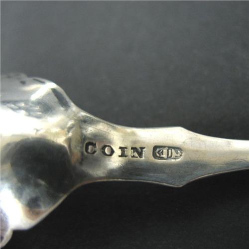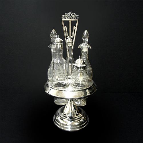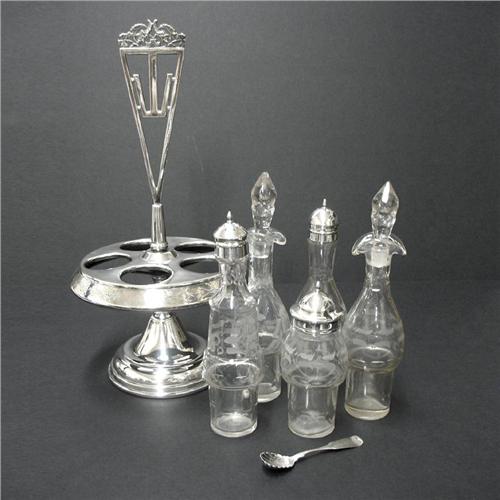 Victorian caster set; six cut and etched glass inserts in fitted silver plated carrier; etched floral design around base; with coin silver spoon in mustard; 14" high; bottom of one stopper is chipped; chip on bottom of mustard; no visible defects