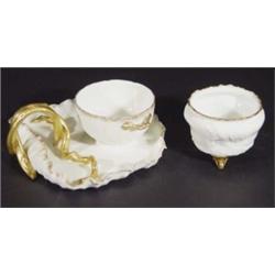 Victorian cream and gilt Moore Brothers leaf shaped tray with frilled edge, a twin handled bowl and a sugar bowl, various marks to bases, largest 22cm in length