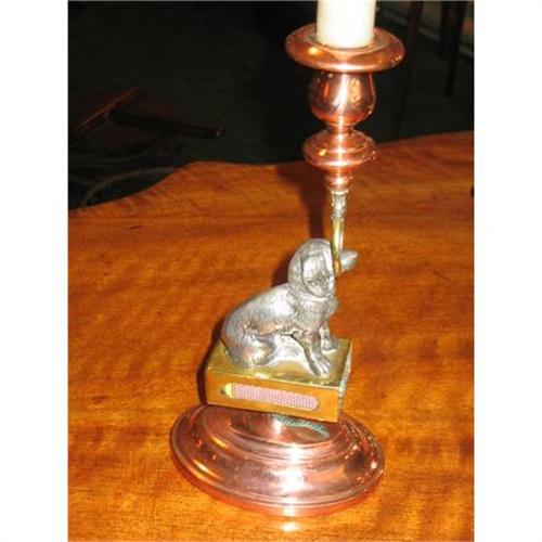This is terrific. The dog is sitting on a box for matches in a brass enclosure. The oval base is of copper. The dog holds in his mouth a brass ring which supports the copper candle holder. Just a really unusual piece.