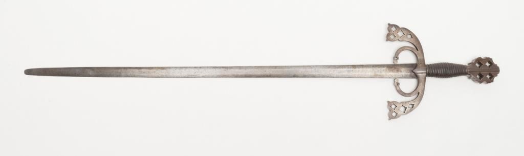 Victorian era knightly sword with good older forged steel blade and nicely made pierced guard and pommel. The grip is of wire wrapped over leather and the condition overall is very good. The sword measures 41” with a 34” blade. Anabsolutely genuine antique that predates 1900 with an old possibly period blade. Est.: $250-$500