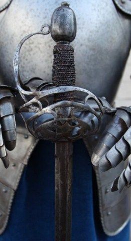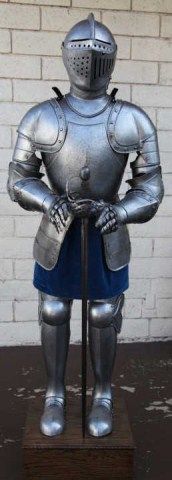 Victorian era suit of armor with closed helmet and fully articulated. The suit measures 67” in height without stand and 73-1/2” including base. The suit has been cleaned, mounted and re-strapped and is agenuine antique suit. Armour was rare even in the 19th century and several European firms made suits to decorate the halls and castles of Europe. This is a well made suit and displays well. Current Toledo made suits areover $7,000 retail and this set is superior. Est.; $3,000-$6,000