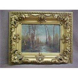 Victorian framed oil on canvas, autumn woodland landscape with stream, signed H. Hall (L.R.), measures 9" x 12", very small tear in canvas