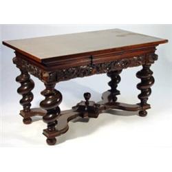 Victorian fruitwood desk, the rectangular top above a heavily carved frieze drawer, each corner w…