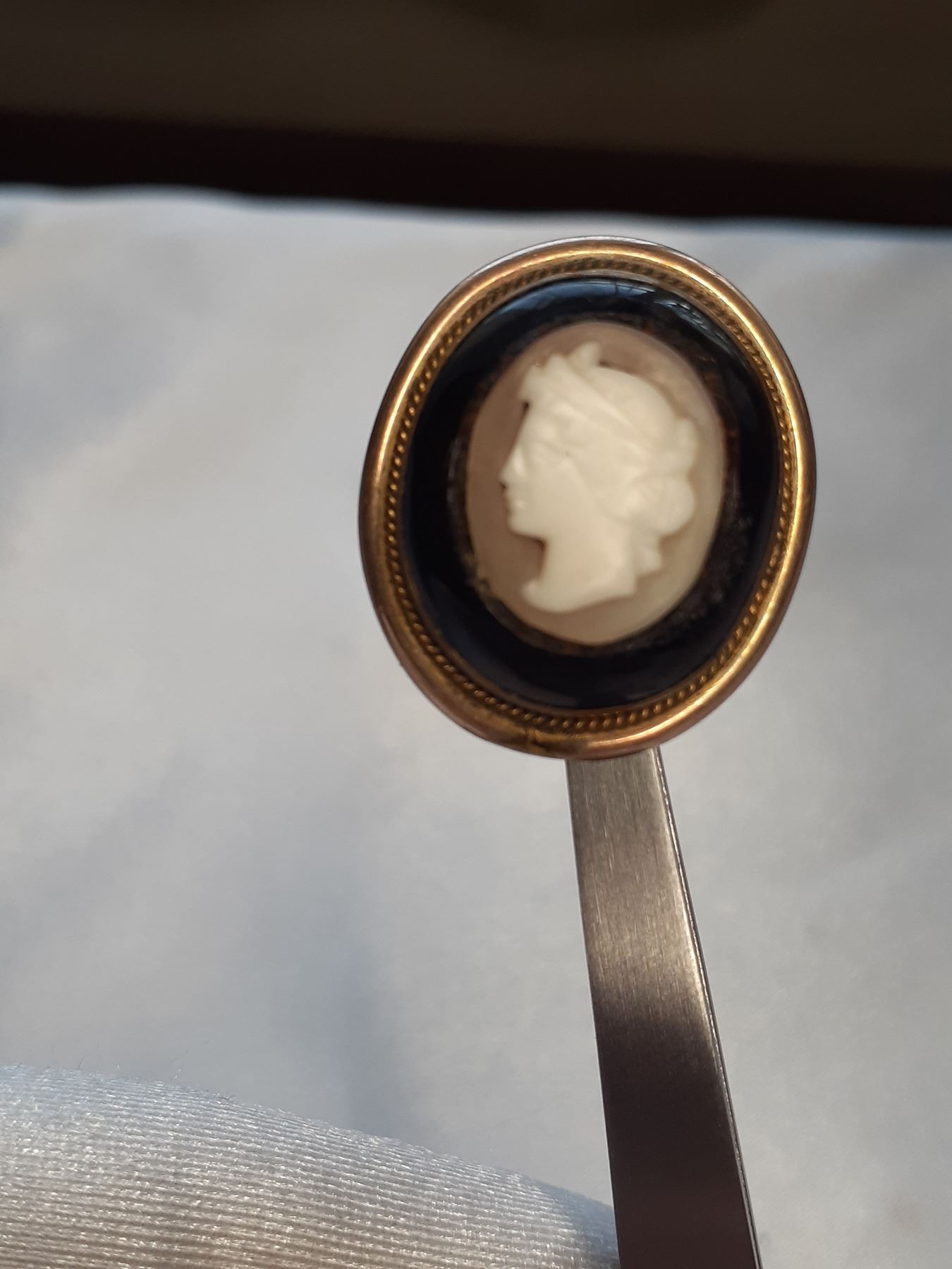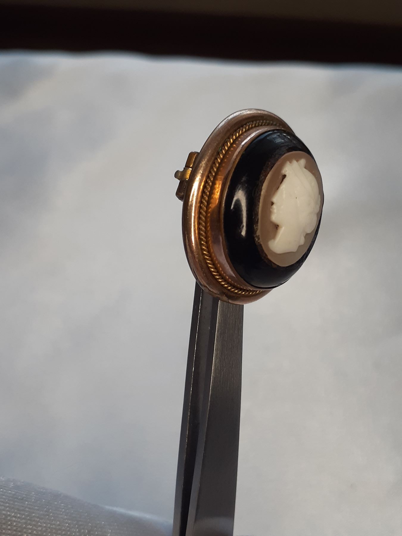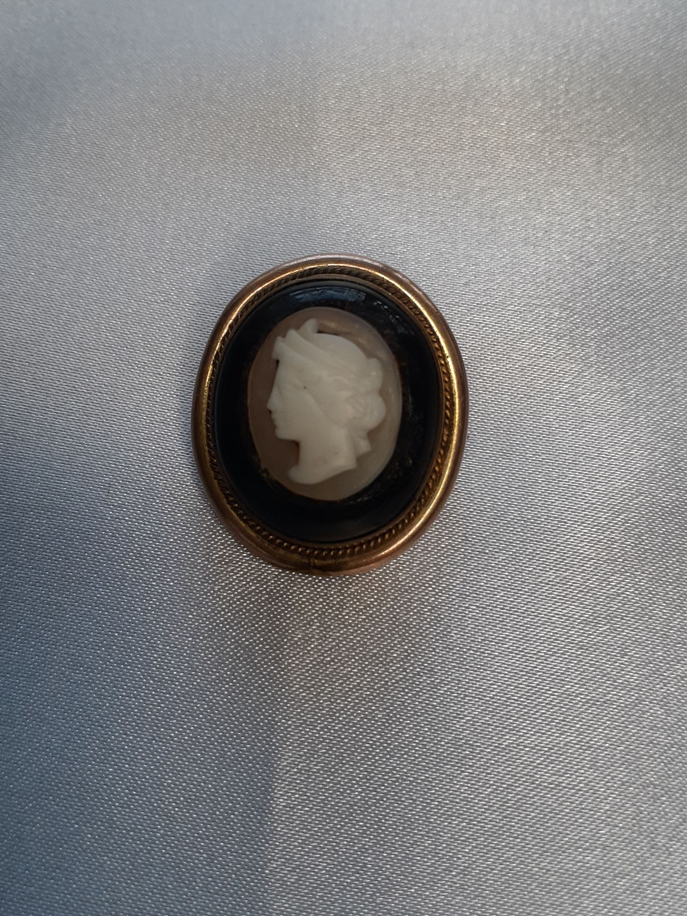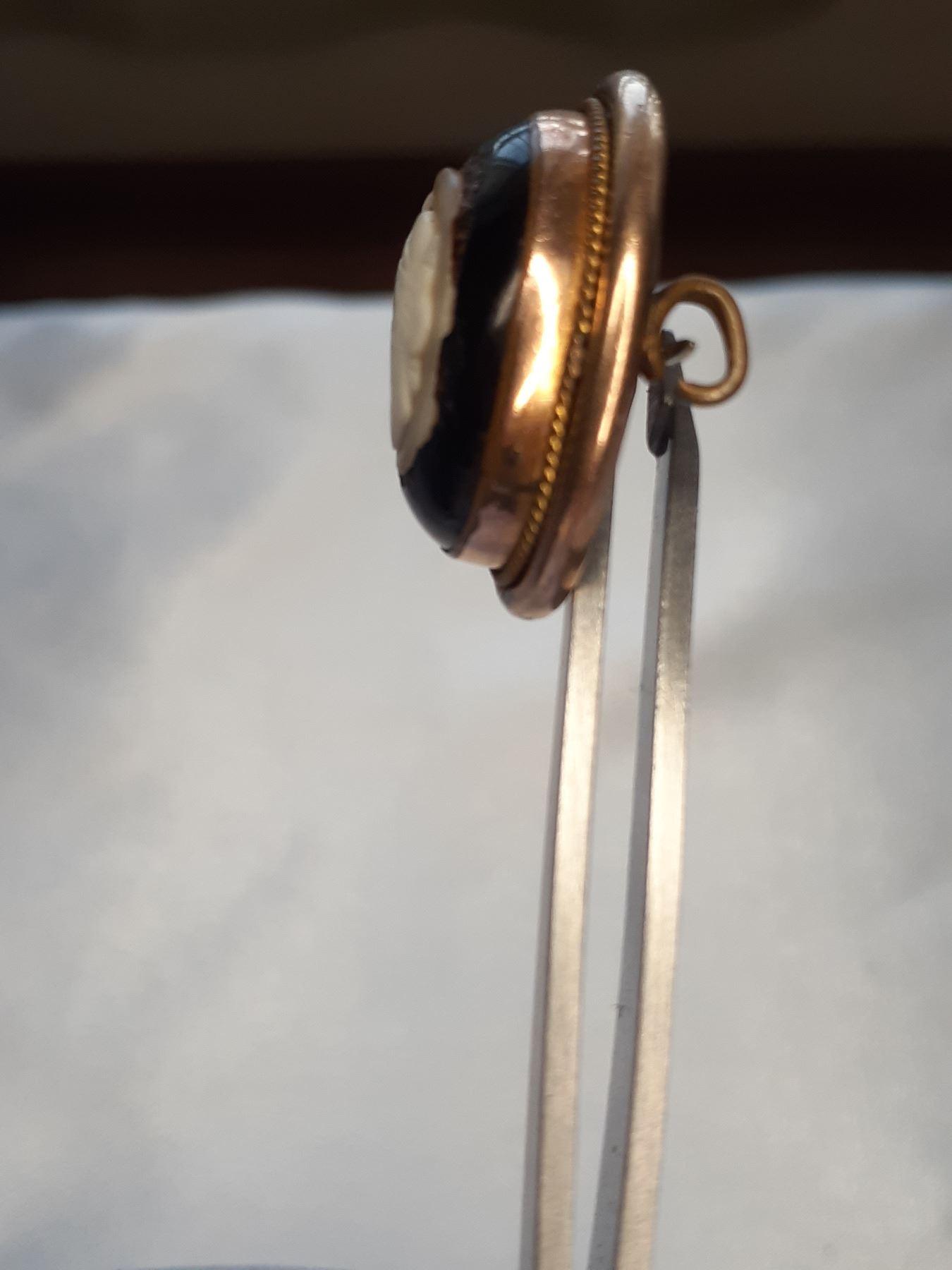 Well hand carved shell cameo mounted in get and gold plated pinchback