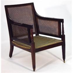 Victorian mahogany bergère chair with floral carved turned supports on tapering legs with brass castors