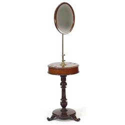 Victorian mahogany gentleman's shaving stand, the oval mirror on a brass telescopic support above a circular pedestal with two lift up compartments supported by a spiral twist column on a platform base with scrolled feet