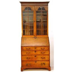 Victorian oak bureau bookcase, fitted a pair of glazed doors enclosing three adjustable shelves, the lower part with a fall enclosing a fitted interior of pigeon holes and drawers above four graduated cockbeaded drawers on bracket feet