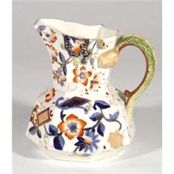 Victorian octagonal Masons style pottery jug with snake handle, hand coloured and transfer printed with Imari style pattern, marks to base, 16cm high