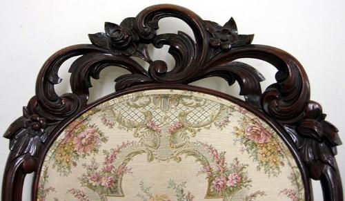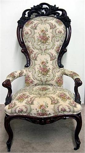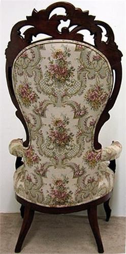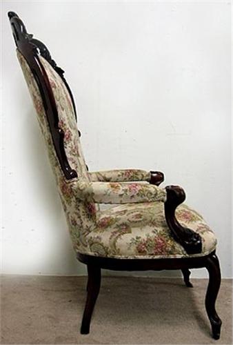 Victorian ornately carved walnut and tapestry upholstered gentleman's armchair; pierced crest with floral and scroll design; repeated pattern on arm supports and crest rail; cabriole front legs on casters; C.1870; 52" high x 27" across x 22" deep (no visible defects)