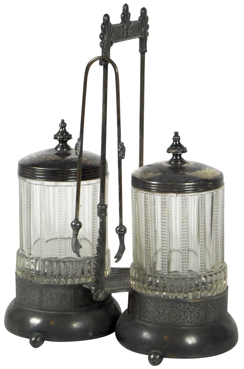Victorian pickle castor, Adelphi Silverplate Co. quadruple-plated holder w/2 pressed glass inserts