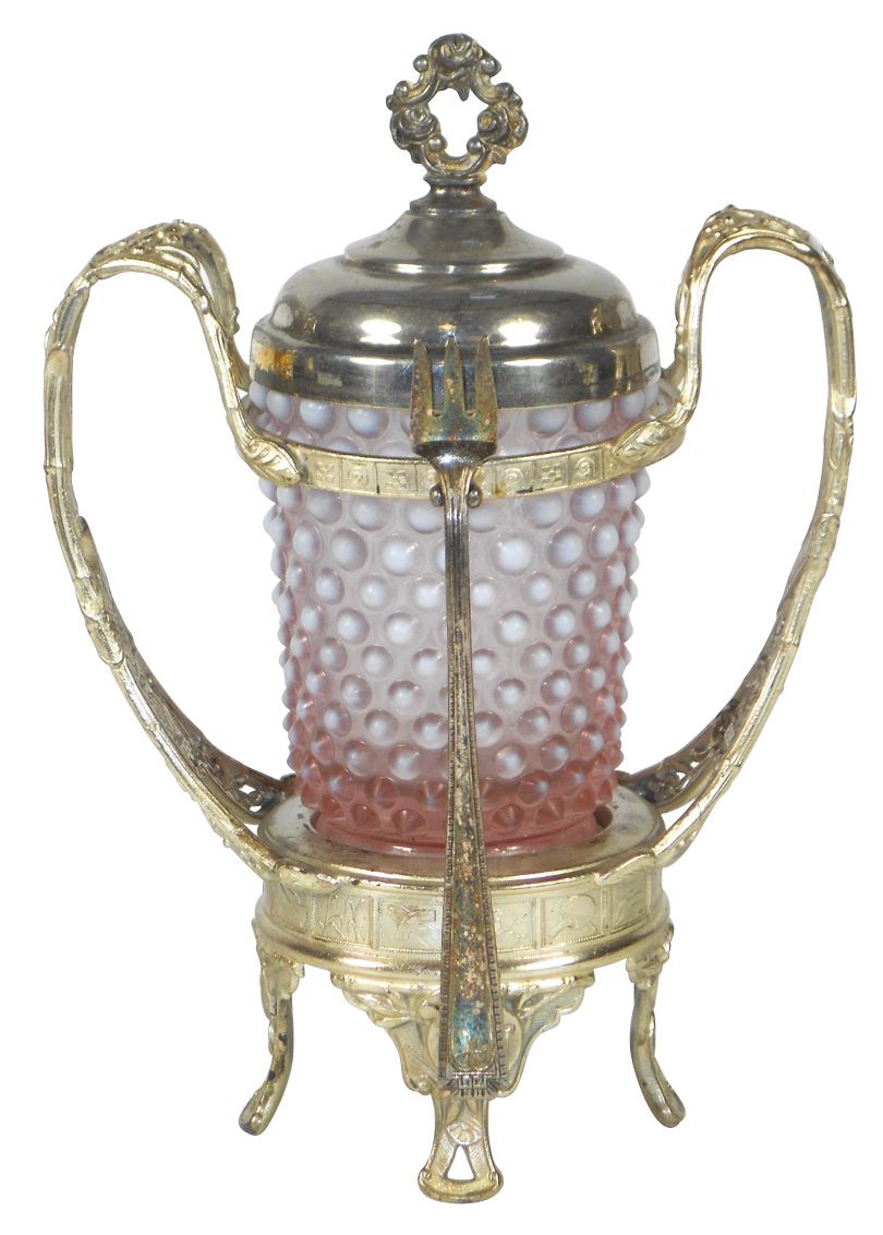 Victorian pickle castor, Fenton hobnail insert in Reed & Barton silver-plated holder, pattern No. 13