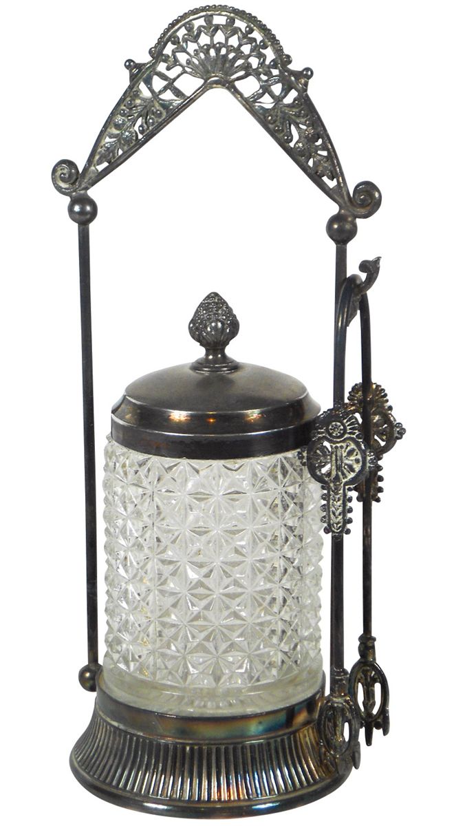 Victorian pickle castor, Meriden Quadruple Plate holder w/pressed glass insert w/lid & tongs, VG cond, 11.5"H.