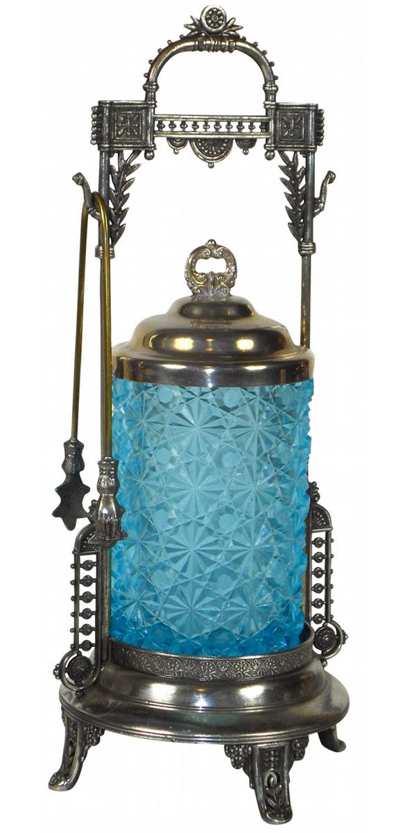Victorian pickle castor, blue button & daisy glass insert in Rogers Smith & Co. Meriden quadruple-plated holder w/lid & tongs, metal lid has slight indentation, o/wise Exc cond, 12.5"H.