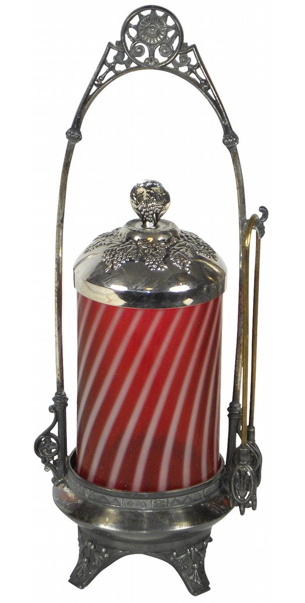 Victorian pickle castor, cranberry & white swirl glass insert in Derby Silver Co. ornamented quadruple-plated holder w/lid & tongs, Exc cond, 13"H.