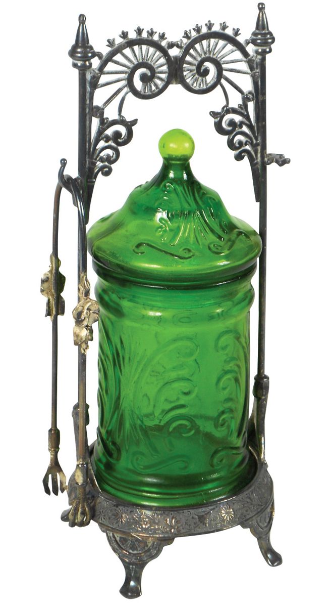 Victorian pickle castor, green pattern glass insert & lid in Wilcox Silver Plate holder w/tongs, slight roughness on inner neck of lid & missing fork, o/wise VG cond, 11"H.