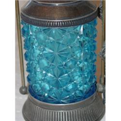 Victorian silver-plate pickle castor with blue glass insert and tongs. Stands 11 1/4" tall.