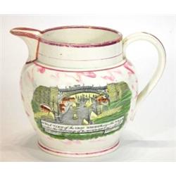 Victorian pink Sunderland lustre jug, hand painted and transfer printed with a view of the Iron B…