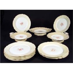 Victorian porcelain part dessert service, comprising twin handled plate, two spear shaped plates and nine dessert plates, hand coloured and transfer printed with sprigs of flowers onto a cream ground