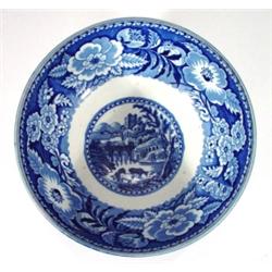 Victorian pottery bowl, transfer printed with blue and white panel of cattle feeding from a stream beneath a castle with floral border, 23cm diameter