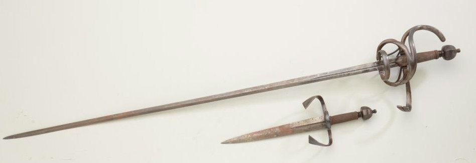 Victorian rapier and left hand dagger of excellent quality, styled after Germanic weapons of the early to mid 17th century. The pair are finely detailed and correctly made with very close and almost imperceptible from the originals. The grips are correctly wire wrapped, the proportion, weights and balance are also near perfect. They are true antiques being 100-150+ years old and show a nice patina and aging and the blade on therapier may well have been from the period. Many craftsmen were employed by several large firms in the 19th century to recreate arms, armor and decorations for restoration of the arms collections to be displayed in castlesand the great halls of Europe. This pair are as good a quality as we have seen in Victorian recreations and they would fool most collectors. Est.: $1,250-$2,500