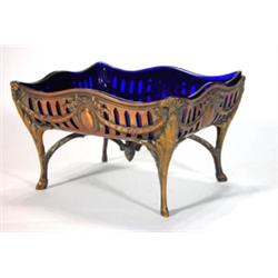 Victorian rectangular Sheffield plated vegetable dish with blue cut glass liner embossed with swags, 23cm in length