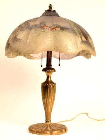 with scenic chip ice scene, base and shade signed Pairpoint. Measures 20" tall X 13 1/2" across shade.